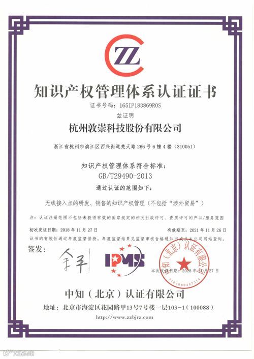 本次认证的范围包含无线接入点的研发与销售,知识产权管理融入了研发、生产、销售以及采购的全价值流程,并实现规范管理。认证证书的获得是对杭州敦崇科技股份有限公司知识产权体系执行的充分认可,同时也是对公司知识产权工作的鼓励和鞭策。