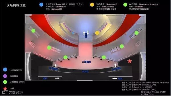 网易展台的无线布置要求,展台无线覆盖分为3个部分,一部分为大化西游游侠有线无线专线,作为现场游戏展示,提供40M专线,另两个部分分别为客户体验区及普通客户服务区,预计需支持无线接入设备200台左右。根据现场需求,我们在展厅布置6台AP,1台硬AC。