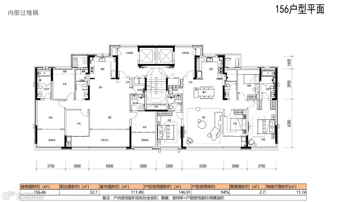 洋房168㎡户型,实际使用面积超170㎡,比销售面积还大2个平方,得房率超100%。
