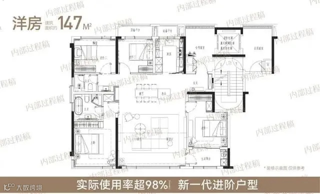 洋房147㎡户型,购房者实际使用面积近145平,赠送面积达到22平,得房率超98%。