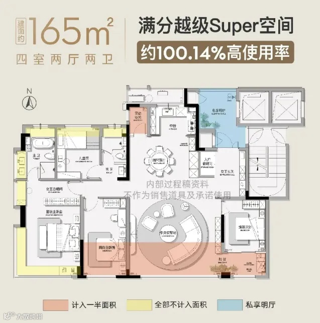 天阜壹号在新规计容的设计上,不计算私享梯明厅的面积,建筑面积约143㎡的户型,使用率可达约97.79%,165㎡户型的使用率突破了100%。