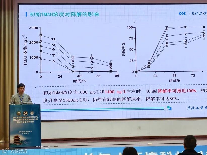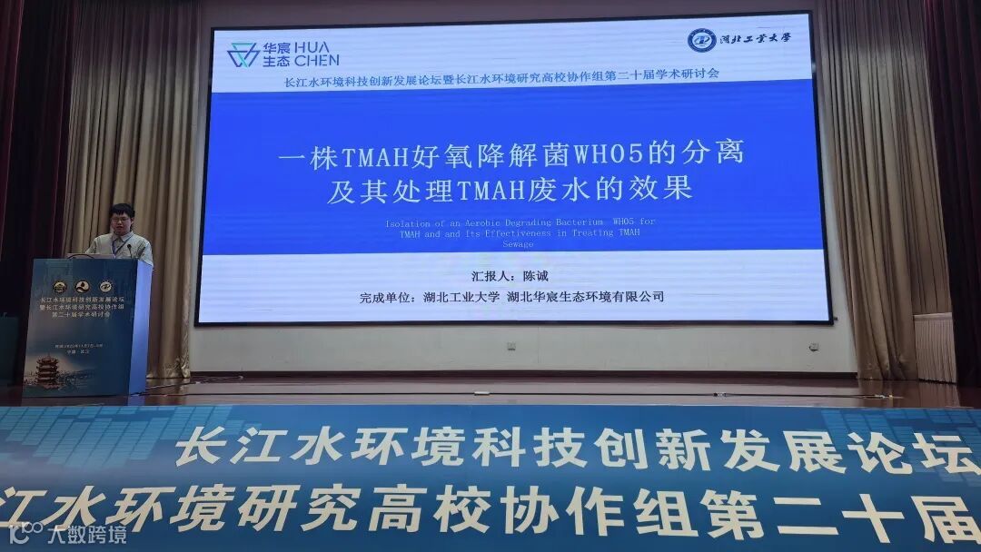 在“长江流域新污染物识别、监测与治理技术研究”主题分会场中,由湖北工业大学与华宸生态通过校企合作模式联合开展的研究备受关注。会上,湖北工业大学土木建筑与环境学院硕士研究生陈诚带来了题为《一株TMAH好氧降解菌的分离及其处理TMAH废水的效果》的研究成果。研究团队从自然环境中成功分离出一株能够高效降解四甲基氢氧化铵(TMAH)的特效好氧菌株,并通过系统实验验证了其在模拟废水中的降解效能。该研究成果为半导体、液晶面板等高科技产业的含TMAH废水处理提供了全新的生物技术解决方案。