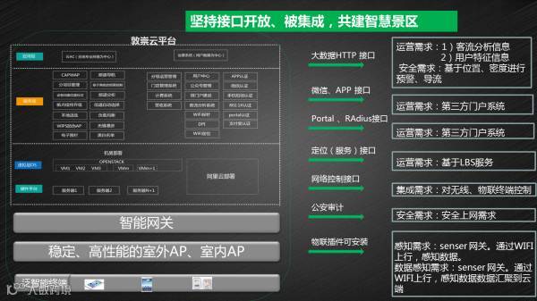 开放大数据HTTP接口;开放微信、APP接口;开放portal、RAdius接口;开放定位(服务)接口;开放网络控制接口;开放公安审计;开放物联插件接口等等,通过被集成的方式,共同打造智慧景区生态圈。