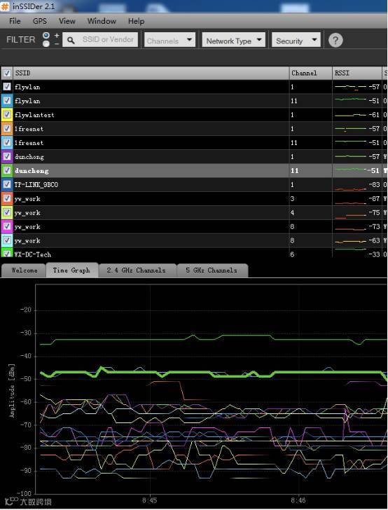采用专业的信号查看软件,观察设备的信号稳定质量,任意截取了其中2分钟的信号测试截图,从图中可以看到,这这个测试的位置点,设备的信号强度始终在-50左右,无大的信号抖动,非常稳定。