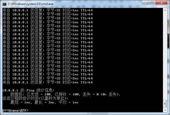 终端连接AP后,随机ping终端的网关100个报文,从效果也可查看到,最低1延时,最高3ms延时,100个包的平均延时为1ms,在所有测试的设备中也是出类拔萃的。