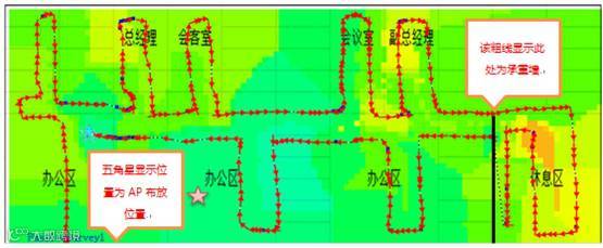 在覆盖测试中,使用Fluke公司的AirMagnet Survey测试软件,测试用WA722M-E型AP使用最大功率100mw,天线内置。场景为一个典型的办公室环境,该办公室长约30米,宽约20米,有部分隔间作为领导办公、会议室场所,其他区域没有任何障碍物。测试结果如下图所示: