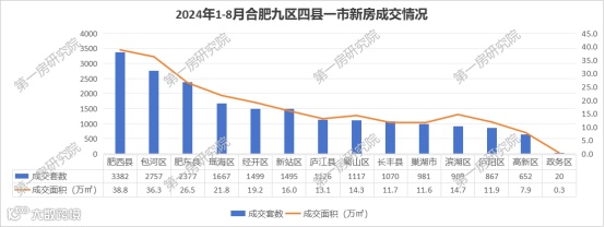 再来看看新房市场,虽然目前市场下行,依然处于低位,但对比合肥九区四县一市来看,肥西市场表现依然较为突出,今年1-8月份,肥西新房成交3382套,成交面积38.8万方,位居九区四县一市首位。超越当前有着淝河、政务东等多热门板块的包河区,这也得益于肥西今年实施的购房补贴及房票等多项利好政策。