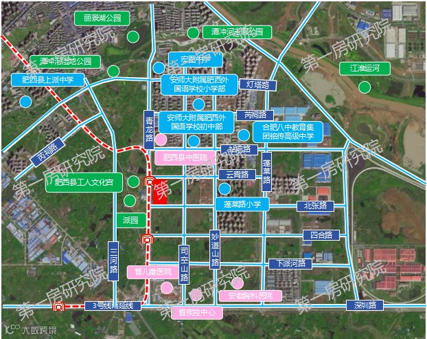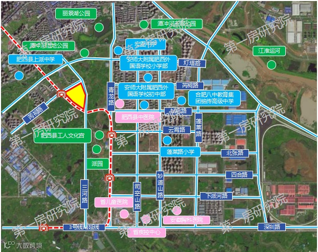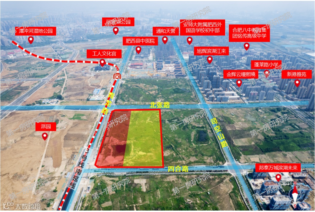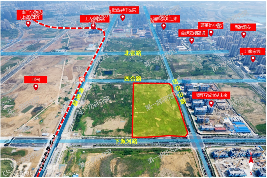 该宗地位于肥西县中派片区,东至司空山路,南至北张路,西至青龙路,北至云霄路,地块西侧紧邻地铁3号线南延线站点,出行便利;北侧紧邻肥西县中医院,南侧有复旦大学附属儿科医院安徽医院、省疾控中心、省胸科医院,医疗配套齐全;周边有安师大附属肥西外国语学校小学部、安师大附属肥西外国语学校初中部、合肥八中教育集团铭传中学、蓬莱路小学等诸多教育资源集萃。派园、潭冲湖湿地公园等景观环伺,环境宜人,地块周边有高速地产、通和地产、金辉地产、旭辉集团等品牌房企开发的成熟小区,地块将进一步完善区域内商业配套。