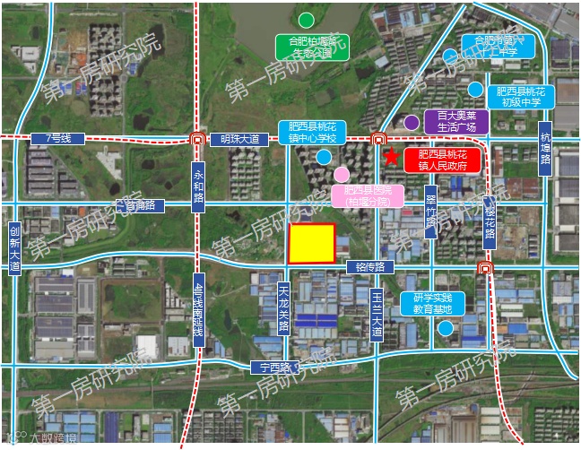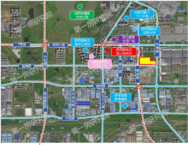 该地块位于肥西泛高新片区杭埠路与菖蒲路交口西北侧,周边路网较为成熟,紧邻地铁7号线,地理位置优越,交通便利,周边有肥西县医院(柏堰分院)、肥西县桃花镇中心学校、肥西县桃花初级中学、百大奥莱生活广场等资源配套,地块紧邻合肥高新区,享受高新区资源配套,北侧毗邻北雁湖,生态环境优良,居住属性高。