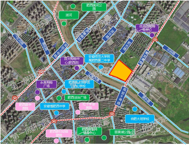 该地块位于肥西上派老城区片区望水路与肥光路交口东北侧,周边路网较为成熟,紧邻地铁轨道交通规划3号线南延线、轨道交通9号线,地理位置优越,交通便利,周边有安徽师范大学附属肥西第二中学、合肥大地学校、肥西县上派学区中心学校、百大购物中心(肥西店)、永良购物广场等资源配套,生态环境优良,派河、肥西滨河公园、丽景湖公园环伺,居住属性高。
