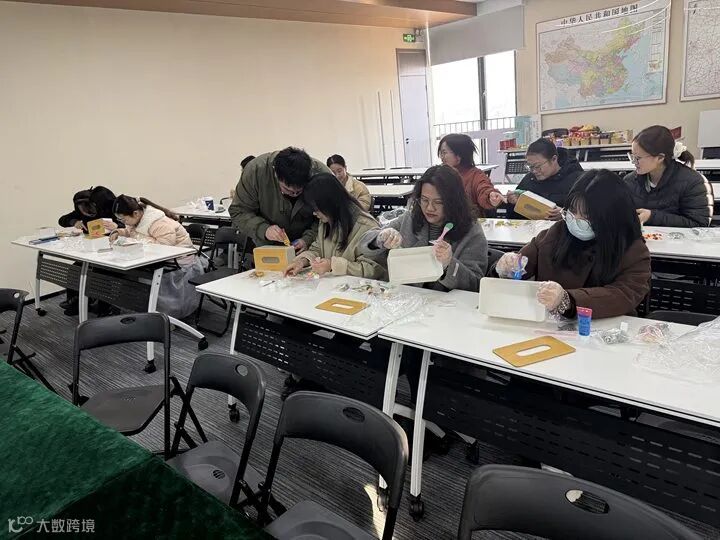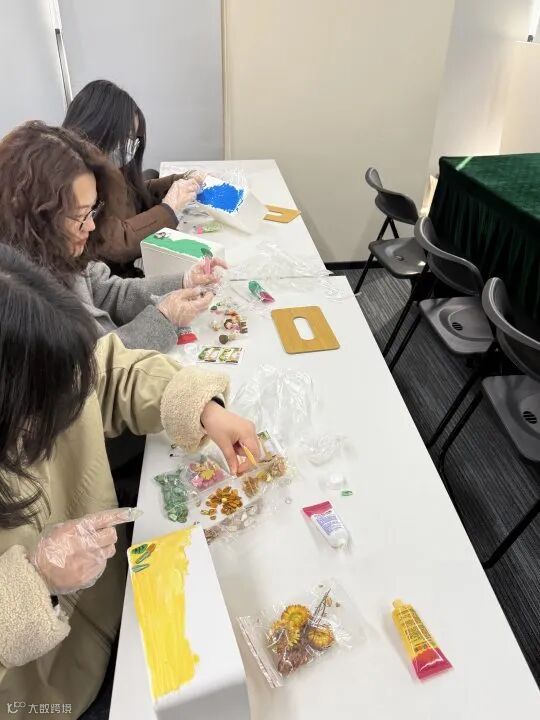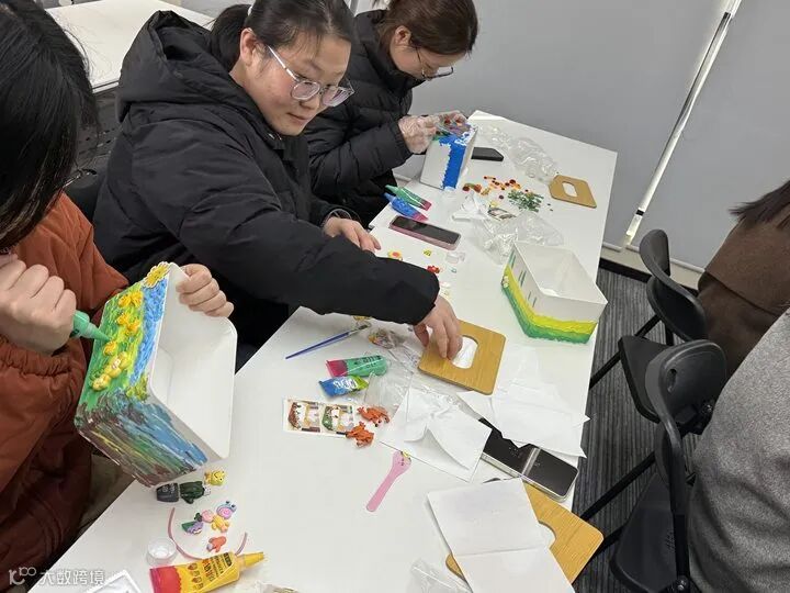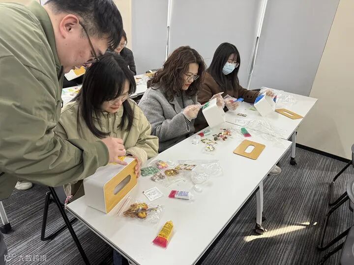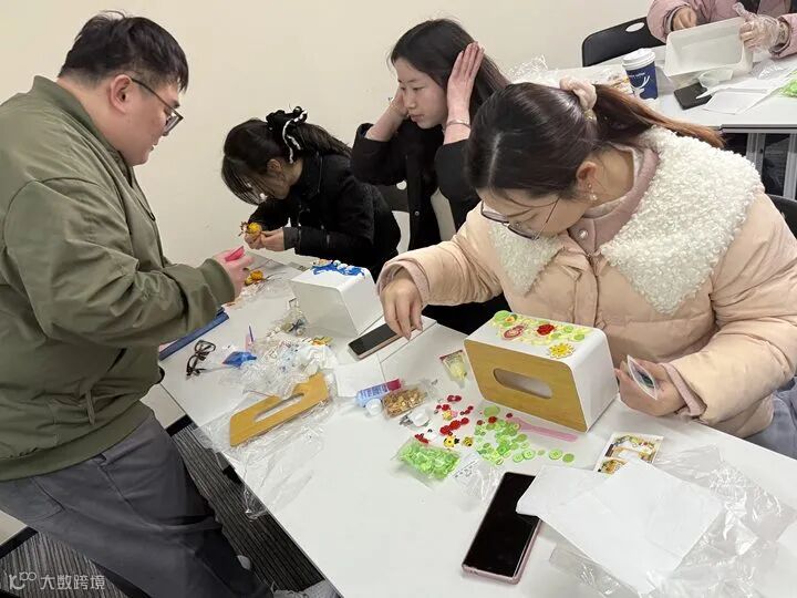 桌上摆满材料包,配件与装饰在巧手下焕发生机,抽纸盒被赋予全新灵魂:搞怪趣味的涂鸦、精致优雅的拼贴……