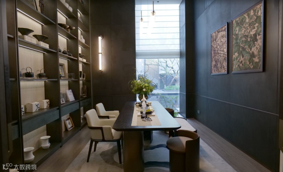 会所各功能区用的是大面积落地窗,可以看到外面1500m²的水池,甄选的是全球奢石“巴西进口亚马逊奢石”,室内用的有金属格栅、木饰面、金属板、皮革、绒布等高品质材料。