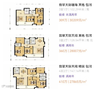 板块天花板翡翠天际,近一年二手房价格从32240元/㎡到31771元/㎡,小幅度下降,低一点在两万七八,高一点也能挂到三万五六。