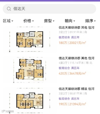 根据二手房优选小程序的数据统计,政务东—龙川路板块的信达天御,琅诗郡一套89.91平米户型,挂牌单价20021元/㎡;香颂庭一套六室两厅的278㎡户型,挂牌单价18705元/㎡。