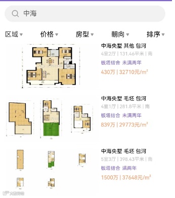 中海央墅的价格也相对坚挺,多套房源挂牌价都在1000万以上,一套398㎡的户型,挂牌总价1500万。