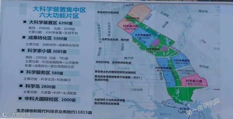 根据规划,大科学装置总体规划图,规划6大功能片区,其中规划中科大国际校区1000亩,即是科大天都校区,成果转化区3360亩,主要功能:创新研究+成果转化空间。