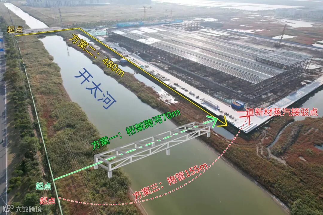 一道新材项目位于开太河西侧,需从河岸东侧现有供热主管道上新建支管道接入至项目用热点,开太河宽度70米。经现场详细勘察,原计划采用架设跨河桁架或在河面狭窄处绕行方式架设供热管道,两种方式均具有建设周期较长、施工难度较大、费用较高等特点,其中架设桁架需在开太河道中打桩,在河面狭窄处绕行需铺设施工便道和管网建设距离长等情况。经与设计单位探讨,决定采用水平定向钻工艺穿越开太河河床方案,优化后的管道总长度从原计划的480米缩减至155米,节省工程建设成本约80万元。