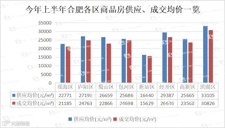 2、今年1-6月份,各区新房供应、成交均价上,滨湖一枝独秀,为唯一均价突破3万/㎡的区域。新站之外,其余区域供应、成交均价都已超过2万/㎡,进入到全民改善的时代。