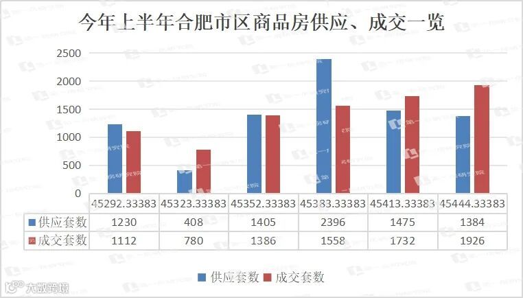 3、今年6月份,合肥市区的新房供应、成交上,供应1384套,成交1926套,整体来看供小于求。其中,6月份的新房成交量,也是今年上半年的最高值。