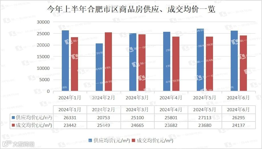 1、今年6月份,合肥新房供应均价26295元/㎡,环比上个月的27133元/㎡,下跌838元/㎡;成交均价24137元/㎡,环比上个月的23680元/㎡,上涨457元/㎡。