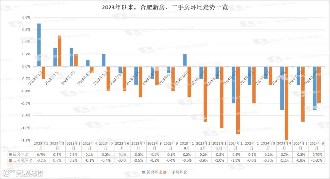 6月份,合肥新房环比下跌0.7%,自去年10月份之后,连续第八个月保持下跌;二手房环比下跌0.6%,自去年3月份之后,连降15个月。