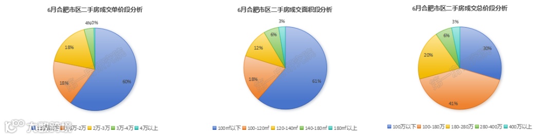从6月合肥市区二手房成交结构来看,1.6万以下的房源占比接近6成,100㎡以下的房源成交占比超6成,100-180万总价段的房源成交占比超4成。通过以上数据不难看出,6月合肥二手房依然是以低单价、低总价、小面积的房源为主。二手房市场购房群体以刚需为主,其次是刚改。但总价段方面高价段成交占比对比上月有提升,说明在,在一部分优质板块的二手房降价后也刺激了一部分客户选择了高品质高价格的楼盘。