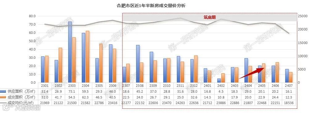 显性存量方面,近12个月合肥显性存量在203.6万㎡左右,按近12个月的月均去化计算,理论月均去化周期为6.9个月左右,月度去化周期呈上升趋势,但整体存量及去化周期相对可控。虽然近5个月市场成交量都在逐月增加,但1-7月的市场供应量大于成交量,因此去化周期在进一步拉长。
