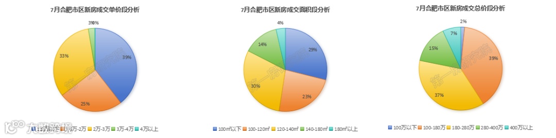 总价段方面,100-180万总价的房源和180-280万总价的房源成交占比较为接近,均是7月成交量最多的总价分段,但如果剔除低价房来看的话180-280是本月成交主力。可以看出,合肥现阶段的新房成交套均水平280万以上是常态。整体来看,7月合肥市区新房成交以刚需+刚改产品为主,其次是纯改善。