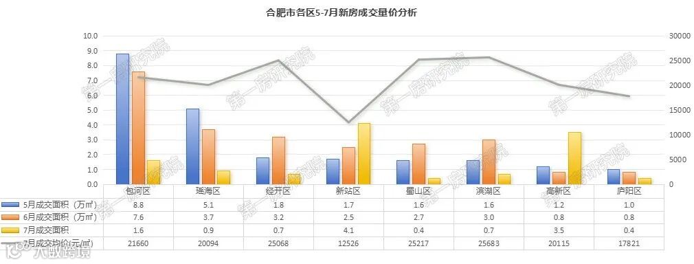 从5-7月各区新房成交来看,除政务区之外的八个区域中,包河、瑶海、经开为成交主力。新站、高新7月受到毓德雅苑、擢秀园两个人才公寓转商品房集中备案的影响,成交量猛增,但同时也拉低了整体市场成交均价。蜀山、滨湖成交量几乎持平。庐阳受在售项目较少原因的影响成交量排名靠后。包河区7月贡献最大的主要是万科城改朗拾森屿、保利海上瑧悦、招商四季臻邸等楼盘,主力基本上都是淝河板块的项目。瑶海区贡献最大的是四川邦泰东方雅颂、伟星宸ONE等项目,分别位于东部新中心板块和瑶海老城区。经开区贡献最大的是建发华润翡翠云璟、龙湖亚伦央璟颂等项目。不难看出,每个月卖得好的还是这么几个楼盘,一方面是这些楼盘品质、房企实力还可以,另一方面,热门区域的热门板块其实货量较多的也就这么几个楼盘。