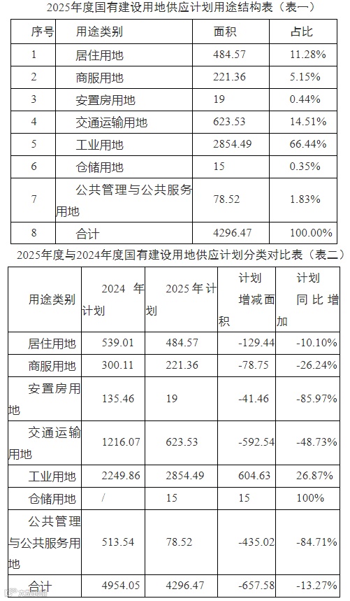 2025年含山计划供应土地4296.47亩,其中工业用地达到惊人的2854.49亩,占比高达66.44%。与2024年相比,工业用地供应量增加了604.63亩,增幅26.87%。