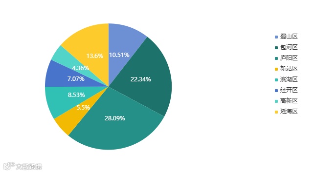 分区域来看,庐阳区成交面积占比28.09%,九区排名第一。包河区成交面积占比22.34%,排名第二。瑶海区成交面积占比13.6%,排名第三。