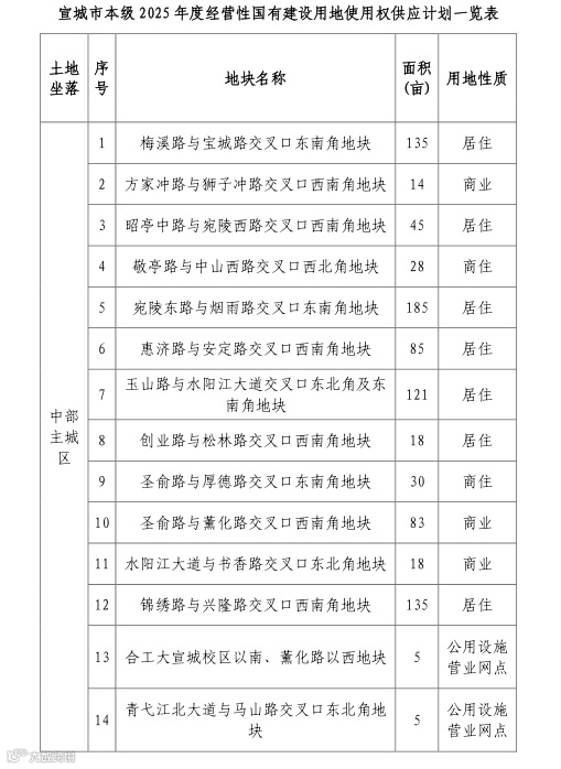 宣城土地市场正在酝酿新一轮变革。就在上个月,宣城经开区一宗19.23亩商业用地以0.5%的溢价率低调成交;根据宣城市本级2025年度经营性国有建设用地供应计划,这份文件揭示了未来一年城市发展的核心脉络。