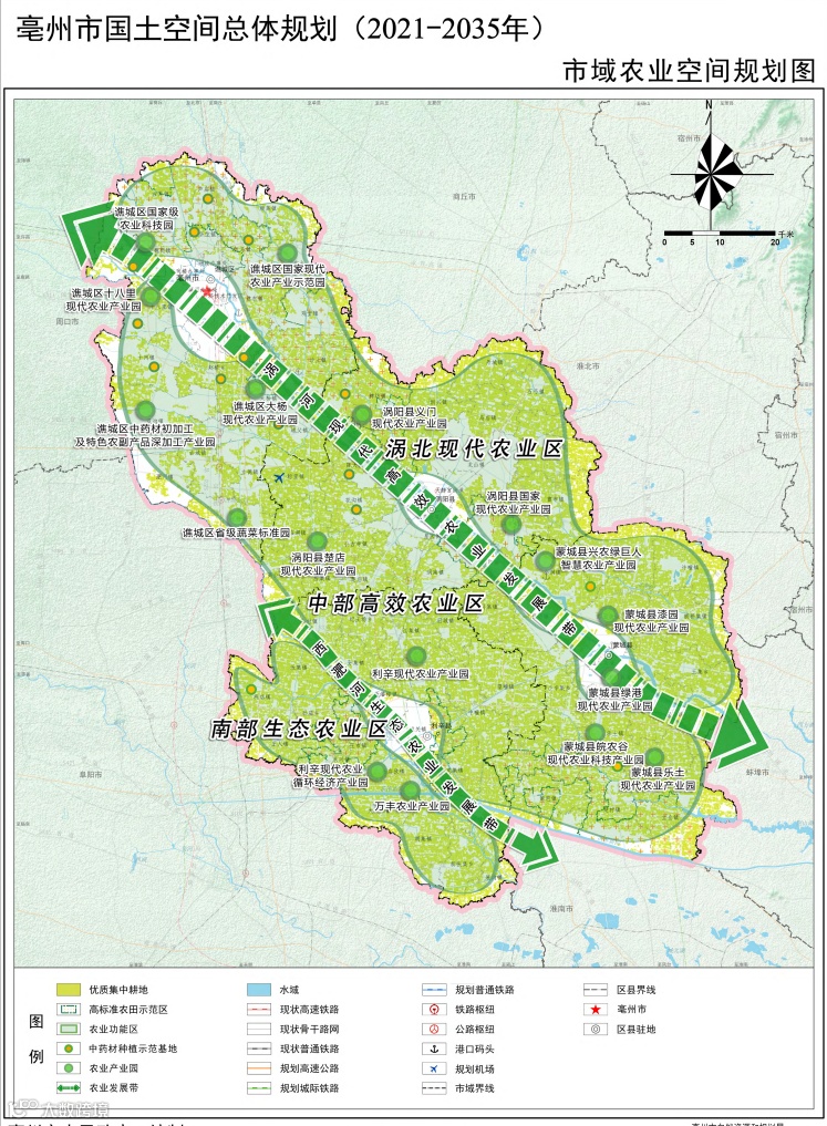 农业空间:划定876万亩耕地保护红线,重点打造涡北现代农业区、中部高效农业区和南部生态农业区,保障粮食安全的同时,推动中药材种植基地规模化发展。
