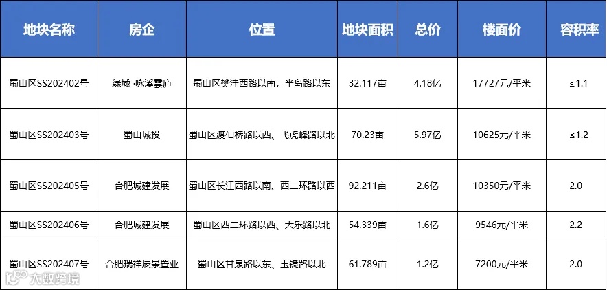 2024年底合肥土拍热度达到高潮,合肥城建拿下的蜀山主城两宗地——SS05地块1380万元/亩(楼面价10350元/㎡)、SS06地块1400万元/亩(楼面价9545元/㎡)。蜀山作为老牌成熟板块,配套齐全、土地稀缺,说白了还是看好有钱人改善换房的底气。