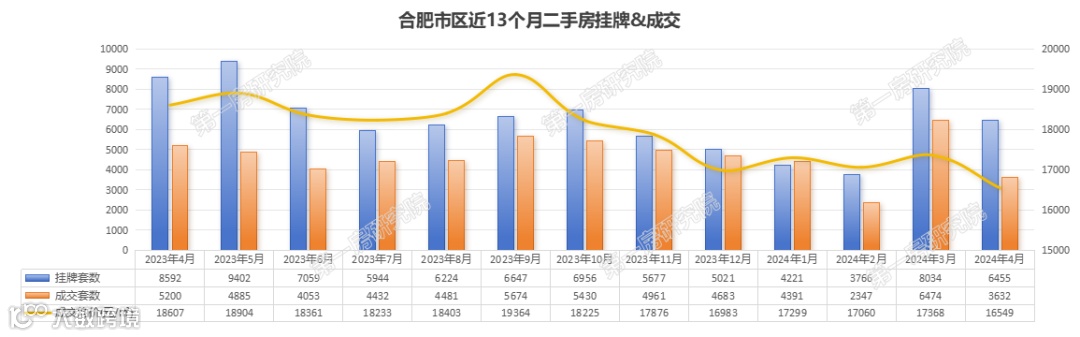 合肥市区近13个月,二手房月均挂牌量6461套,月均成交4665套,月均成交均价约17941元/㎡;从走势上来看,近1年整体成交量较为稳定,而成交价则有持续下探的趋势。近2个月,合肥市区二手房有明显回暖趋势。