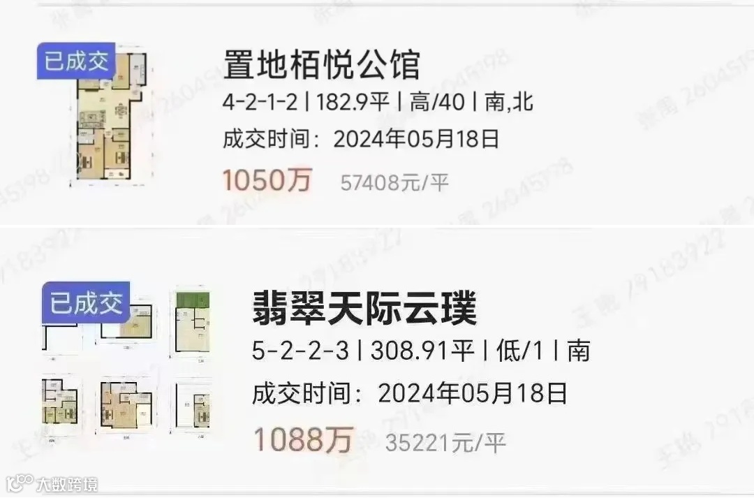 比如置地栢悦公馆,一套建面约182平的大平层房源,成交单价5.74万/平,成交总价1050万。