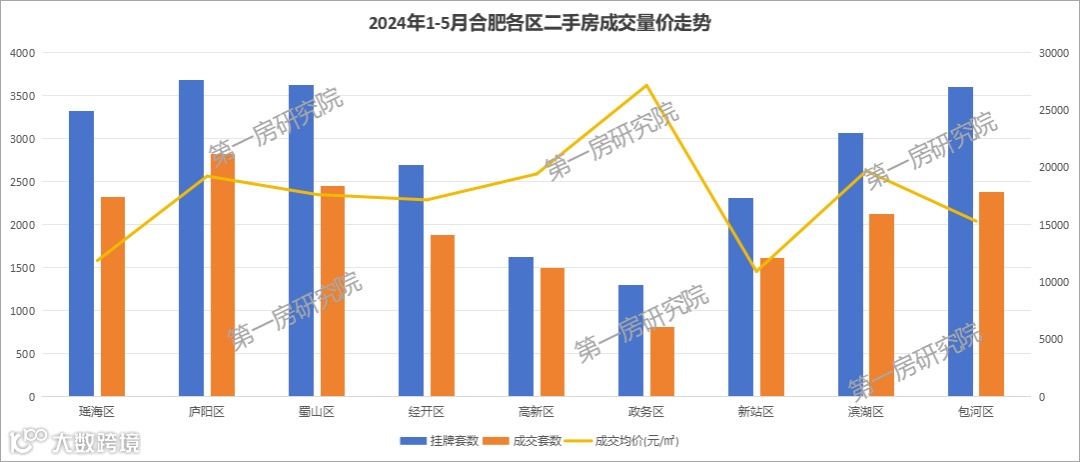 截至5月21日,今年合肥九区二手房成交来看,庐阳区排名第一,蜀山、包河、瑶海、滨湖较为平均,供应均在3000套以上,成交量均在2000套以上。政务区受相对来说二手房源少的原因,成交量最少,但成交均价2.72万/㎡,各区中排名最高。