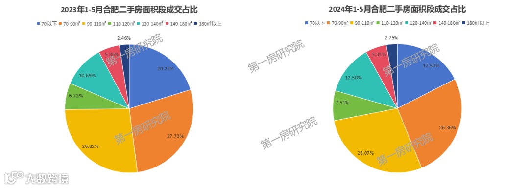 从今年二手房成交结构来看,90-110平米户型占比最高,其次是70-90平米户型,110平以下户型占比超过一半,由此也可以看出,二手房主要还是以刚需为主。与2023年同期相比,改善型户型占比在增加,尤其120-140平以及180平以上户型占比均上涨。