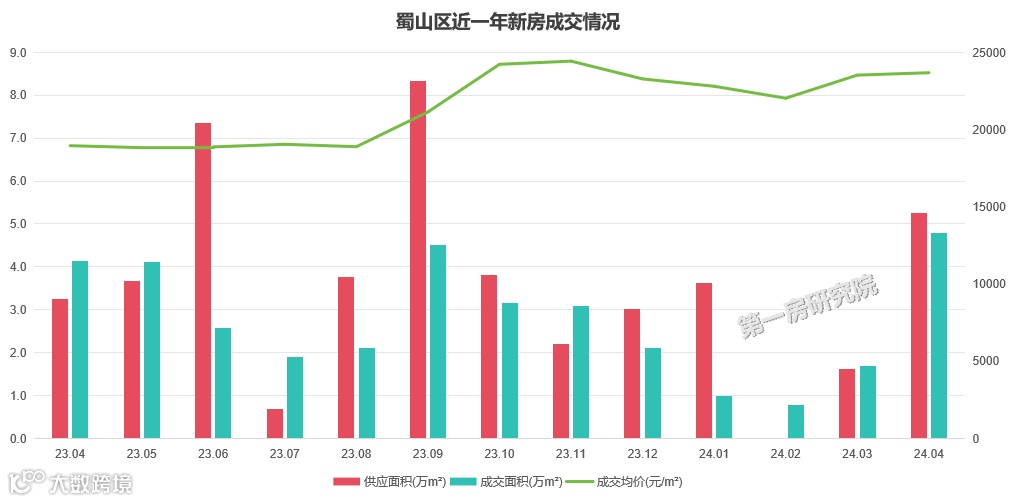 根据第一房研究院AI楼市指数系统统计数据显示,蜀山区近一年成交均价总体处于上升趋势,4月成交均价23679元/m²。自2月开始,成交量处于上升趋势。2024年4月成交均价同比上升25%。成交方面2024年4月环比上涨185%。