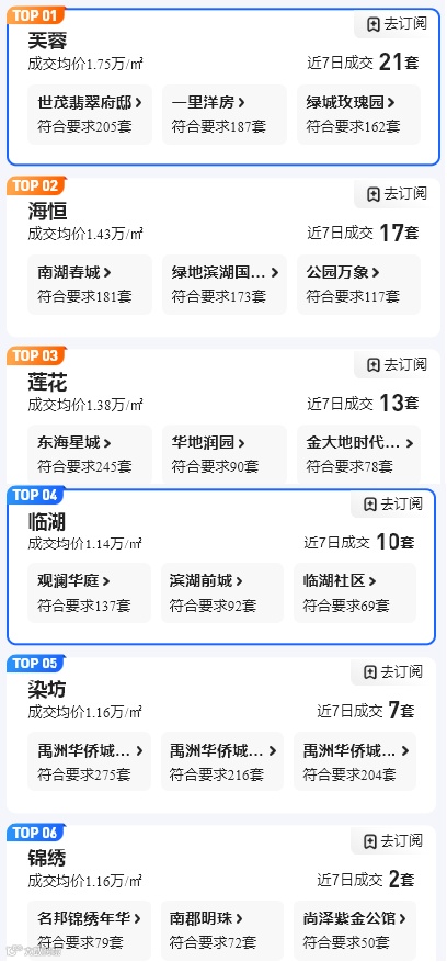 经开区整体小区成交价格在1.1-17万/㎡,其中芙蓉片区成交价最高,其次是海恒片区。但一些品质次新房保值率较高,比如翡翠湖板块绿城玫瑰园,挂牌均价在3.8万/㎡,成交价格在3万/㎡,这个成交价格基本与目前经开区在售高端改善项目价格持平,但一些房龄较长老破小价格相对较低。