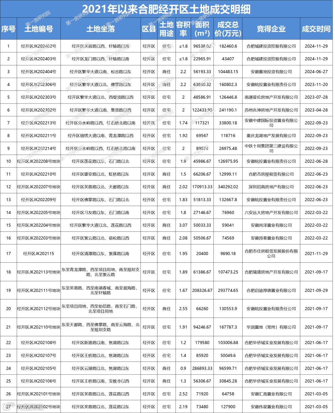 2021年以来经开区供应27宗涉宅地块,2023-2024年仅成交6宗,稀缺性凸显。皖投JK202306号地块以13807元/㎡楼面价刷新区域纪录,新供应地块不论是位置还是容积率上都较之前有很大改善。