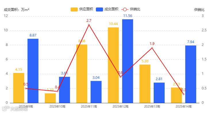 成交套数:第8-9周:1935套→1976套;第10周:小幅回落;第11周:趋于平稳;第12周:2033套→第13周1542套→第14周1407套;第14周:成交 1407套,环比下降 8.75%。