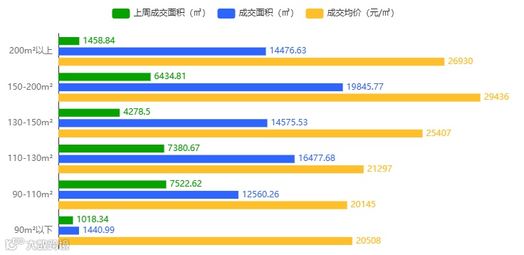 从成交面积段来看,本周成交面积段150-200m²以上的占比最大。