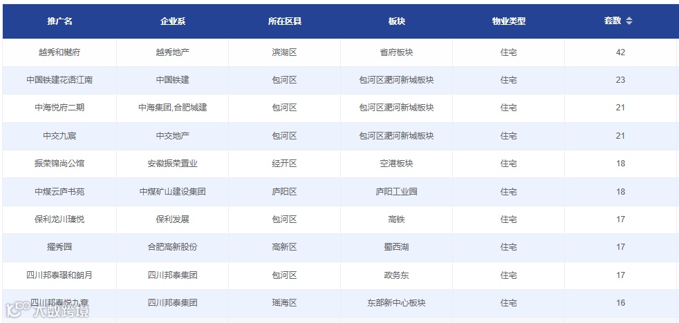 区域分布:政务区 28882元/㎡、滨湖新区 22429元/㎡、蜀山区 20547元/㎡、高新区均价超 2万/㎡,庐阳、高新、经开区均价环比下降,其余区域上涨。
