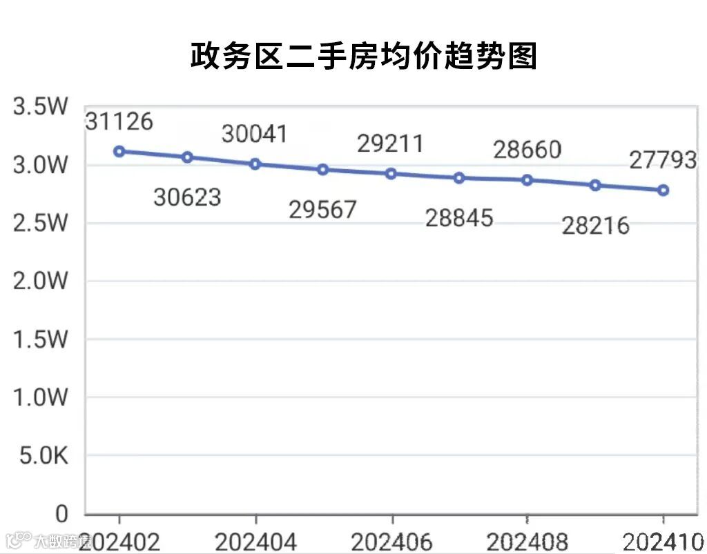 所以在新房项目少的情况下,政务区的二手房市场是主力战场。政务区近一年的二手房价呈现下降趋势,年初的3.1万/m²,截至10月,最新二手房成交均价在2.78万/m²,下降了3千/m²。在整体二手房市场下行的情况,政务区也不例外。