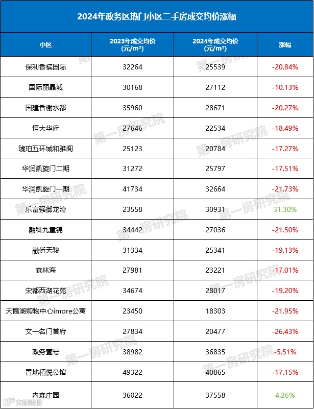 从整理的2024年政务区挂牌最多的部分项目,这些小区算是政务区热度较高的,从近一年的二手房成交价对比来看,大部分的小区都是下跌,跌幅最狠的是文一名门首府,近一年下降了26.43%。另外乐富强御龙湾和内森庄园近一年是涨的,乐富强御龙湾涨了31%,这个在大环境市场下行的情况,小区成交均价上涨是较为难得的。