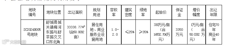 4.其他相关规定。六安市公共资源交易中心舒城县分中心将根据申请截止时的审核情况,确定地块公开出让的具体方式(挂牌或拍卖),并告知所有申请人。符合竞买条件并取得竞买资格的竞买人达到2家以上(含2家)的地块,按拍卖方式出让,竞买人不足2家的地块,按挂牌方式出让,采取拍卖方式出让的,出让人与竞买人须严格遵守拍卖出让文件的规定;采取挂牌方式出让的,出让人与竞买人须严格遵守挂牌出让文件的规定。