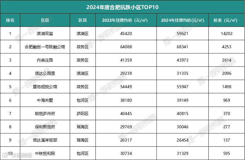 根据第一房研究院AI楼市指数系统统计数据,对比合肥市区2023年全年单个小区整体挂牌均价和2024年挂牌均价,再结合地段、品牌等因素挑选了2024年度截至目前,合肥10大抗跌二手房小区,最高1年上涨约1.42万/㎡,具体小区明细如下: