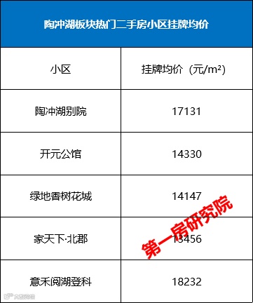 目前板块内的热门二手房小区挂牌均价如下,大部分都在1.4万/m²,陶冲湖别院1.7万/m²,意禾阅湖登科1.8万/m²。