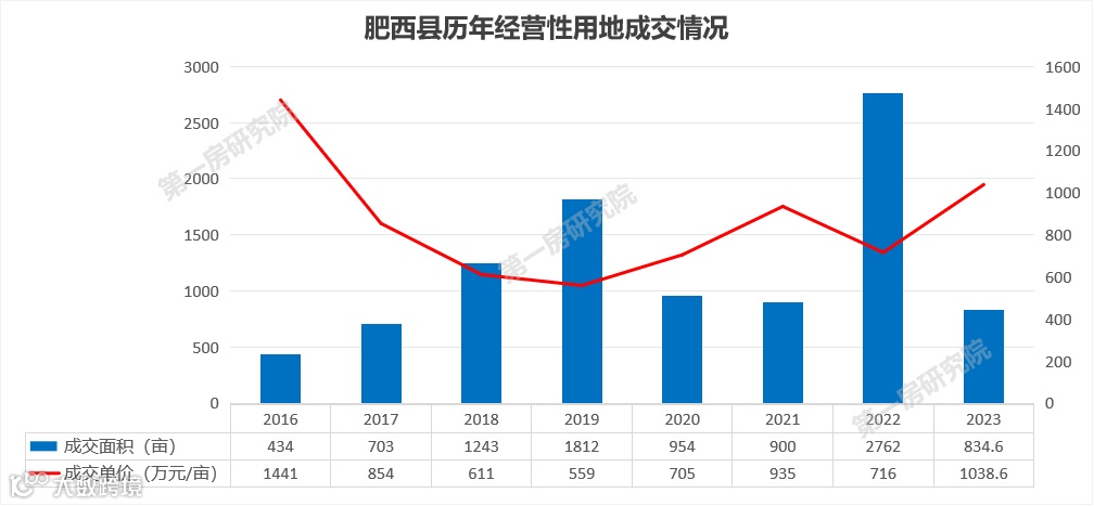 作为安徽省首个千亿县,肥西市场发展迅猛。肥西县近6年经营性用地年均成交量1008亩,2022年成交2762亩,对比2021年全年增长207%,土地规模翻近三倍。在土地成交单价方面,近几年肥西涉宅用地成交均价相对稳定,平均年成交均价稳定在746万/亩。